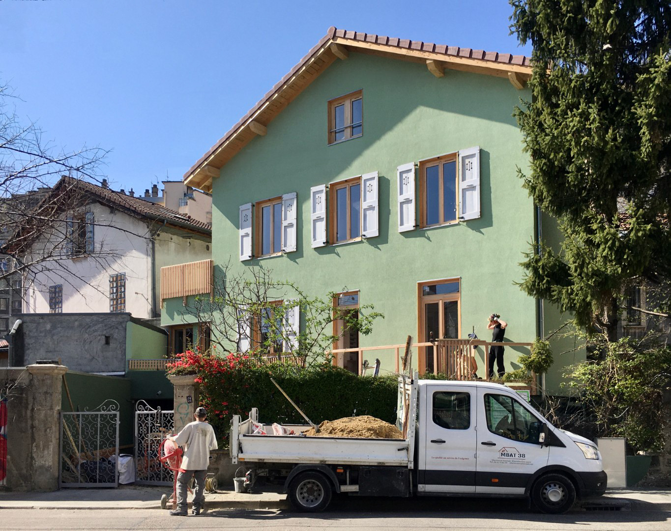 L’entrée de la maison est restée commune et organise de part et d’autre deux appartements de type « T1 », pour l'intimité de chacun des co-parents (comprenant cuisine/chambre et SDB, élements non partageables). La circulation commune se prolonge jusqu’à l’étage où s’organise le salon partagé. Marie et Vivien avaient à cœur de retrouver un foyer, dans cette maison, pour accueillir les instants familiaux qu'ils continuaient d'affectionner. Celui-ci devait être "multi-usages", devait permettre la projection de films, l'organisation de grandes tablées conviviales, mais aussi l’épanouissement des temps quotidiens. Le partitionnement des pièces a été très préservé, l'espace du salon a été décloisonné et seules des pièces humides, 3 salles de bains et 2 cuisines, ont été recréées. Ce parti pris a ainsi permis de préserver au maximum les éléments et les matériaux qui pouvaient être conservés, ceci dans le souci de proposer une multiplicité et une évolutivité des usages, dans une atmosphère singulière et chaleureuse. L’attention portée au "faire avec"a été corrélée à la question du confort thermique. La maison ayant un aspect extérieur très détérioré et sans grande qualité, une isolation par l'extérieur s'est rapidement imposée, avec en complément le remplacement de la chaudière à fioul par une chaudière à granulés et la création d'un système de ventilation performant. Cette architecture d'apparence simple en extérieur a permis d'exploiter les potentiels que la construction d'origine proposait, avec un budget maîtrisé. Nous avons ensemble réalisé des choix tranchés et des actions ciblées pour se concentrer sur ce qui semblait être l'essentiel pour ce projet, privilégier la générosité de l'espace et le plaisir d'habiter (encore) ensemble.