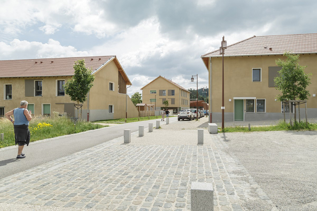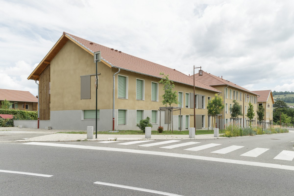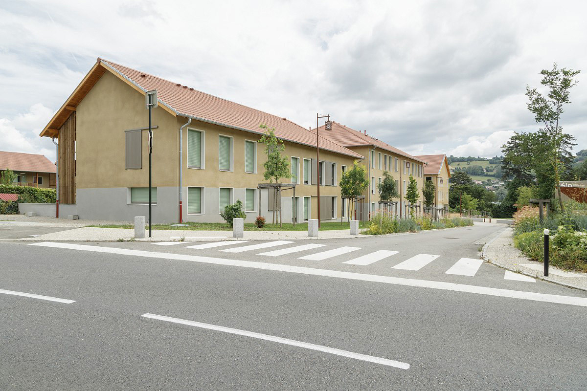 L’opération s’inscrit dans le projet urbain «Cœur de village de Paladru». Elle s’articule avec la construction du musée archéologique et a pour ambition de densifier le village tout en préservant son identité. Elle comprend 35 nouveaux logements (dont 11 locatifs sociaux) répartis sur deux îlots disposés au nord et au sud de la future rue de la plage. Les bâtiments abritent une diversité de types de logements : des collectifs dotés de balcons ou d’accès à un jardin, des logements « intermédiaires » (superposés mais dont les accès sont individuels) et des maisons individuelles, mitoyennes pour certaines ou isolée dans le cas de celle qui ponctue l’opération à l’extrémité sud, le long du chemin de promenade de bord de lac. Les logements sont distribués par des cœurs d’îlots qui accueillent les usages domestiques, les cheminements, les stationnements, les jardins et composent un ensemble à dominante végétale qui préserve une large transparence visuelle entre le village et le lac. Ce paysage intérieur, animé par les allers et venues des habitants, est traversé par un réseau de venelles qui le relie au reste du village. Côté rue, l’architecture des bâtiments compose une silhouette dont les proportions et les teintes rappellent celles des granges dauphinoises en pisé. Les façades sont lisses et régulières, percées de généreuses ouvertures semblables dans leur dessin à celles des maisons de ville des bourgs du tour du lac. La composition paysagère des îlots et l’architecture des bâtiments s’entremêlent pour fabriquer la qualité du cadre de vie individuel et collectif du «Cœur de village de Paladru».